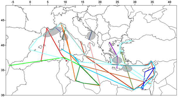 TRANSMED aims, in fine, at developing a network for monitoring the surface of the Mediterranean, using ships of opportunity. Figure 1 represents such an optimal network, based on existing/actual shipping lines. It includes routes crossing the whole basins, sampling the dense water formation areas, and investigating poorly-known areas. Ferries are especially adequate, since they allow building time series with a relatively high temporal scale. Thus it is generally possible to correctly describe the mesoscale, which is present everywhere in the Mediterranean. Usually sub-sampled data are sent in real time (via Inmarsat), and contribute to operational oceanography.